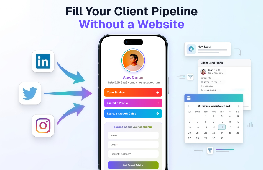 A consultant who builds a visible presence on LinkedIn, Twitter, or Instagram is generating attention from potential clients every day. People read a post, find it useful, click through to the profile, see the bio, and then — in most cases — do nothing. There is nowhere specific to go, no clear action to take, and no way for the consultant to follow up.